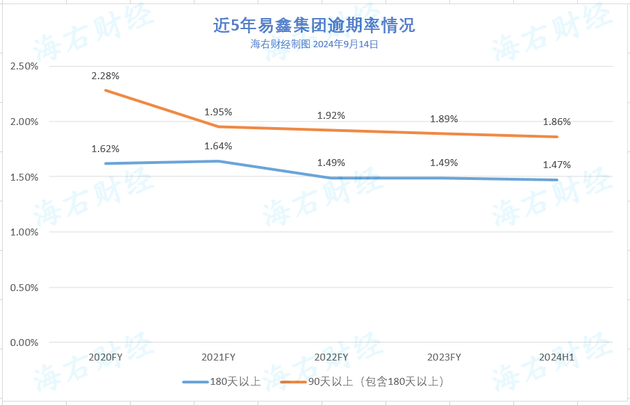 2017年时,易鑫集团融资租借作事业务收入为67%,2018年升至74%,自2019年,易鑫集团的融租业务收入占总收入的比重抓续下滑。2024年6月末,该板块业务收入为9.46亿元,占总营收比重降至21.18%。